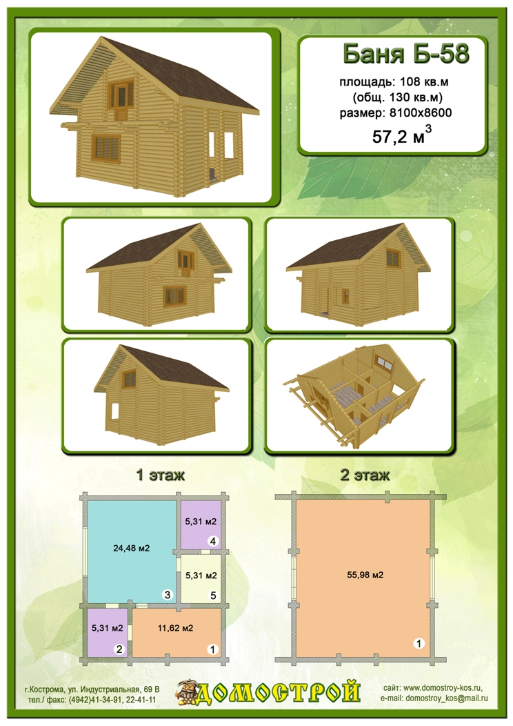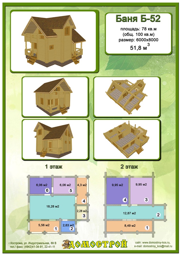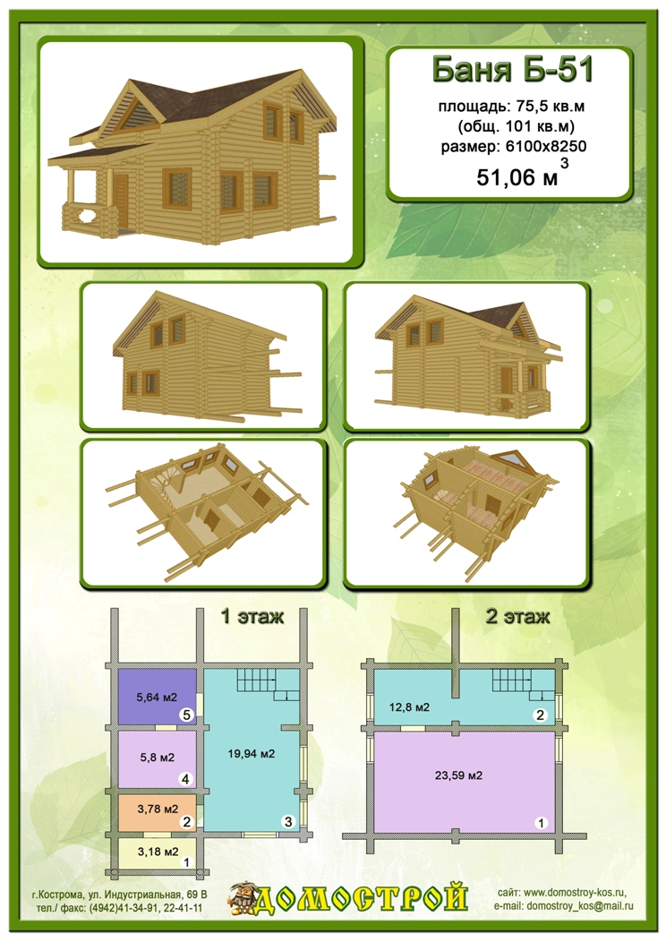 Баня Б-51 Размер: 6100х8250, Бревно D240: 51,06 м3 |