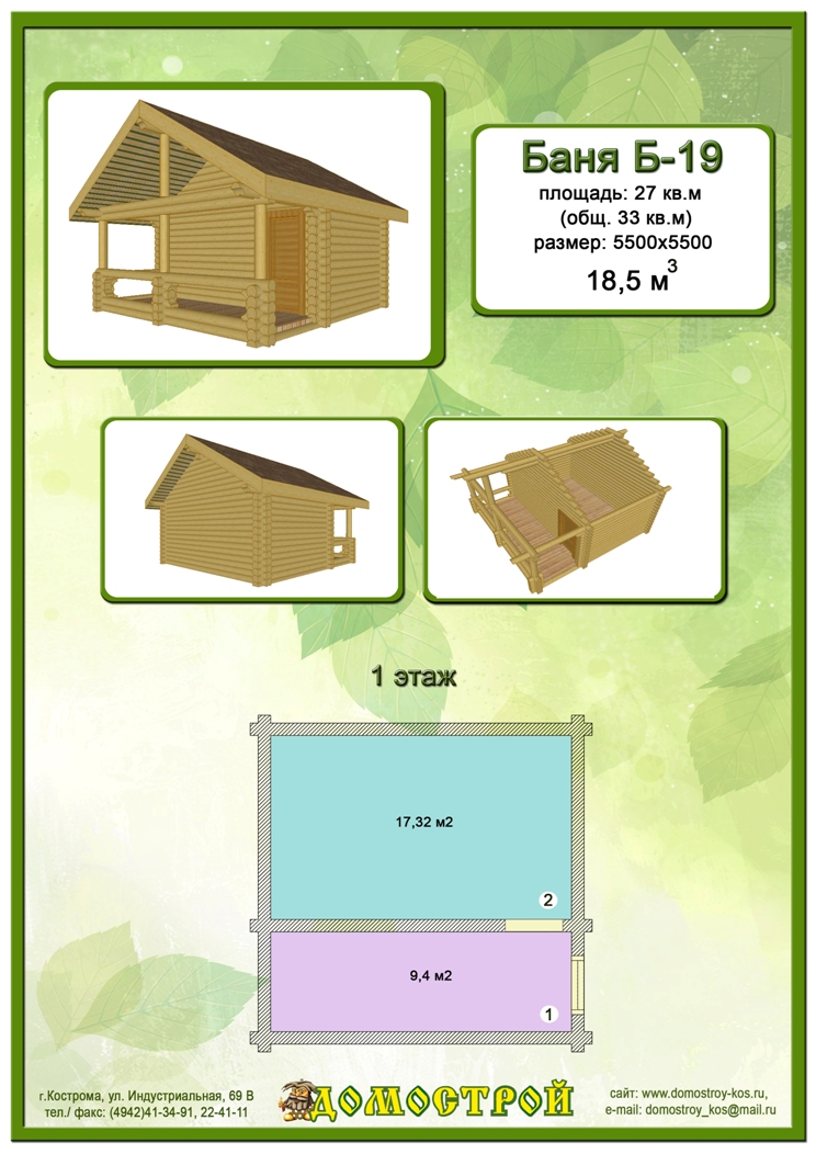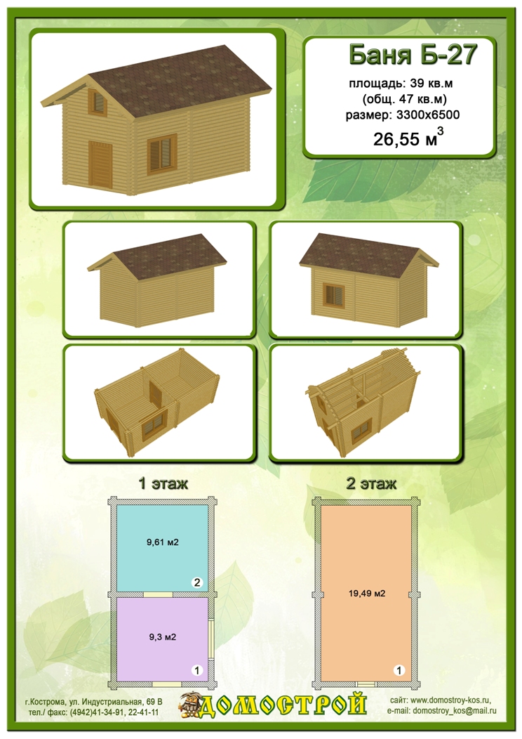 Баня Б-27 Размер: 3300х6500, Бревно D200: 26,55 м3 |