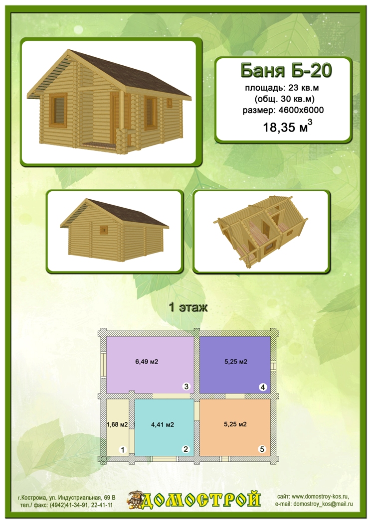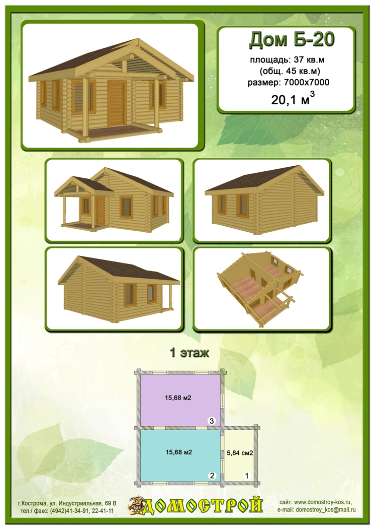 Дом Б-20 Размер: 4600х6000, Бревно D200: 18,35 м3 |