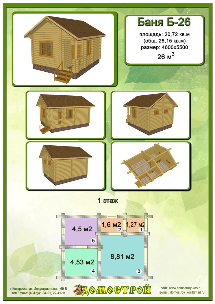 Дом Б-26 Размер: 4600х5500, Бревно D220: 26 м3 |