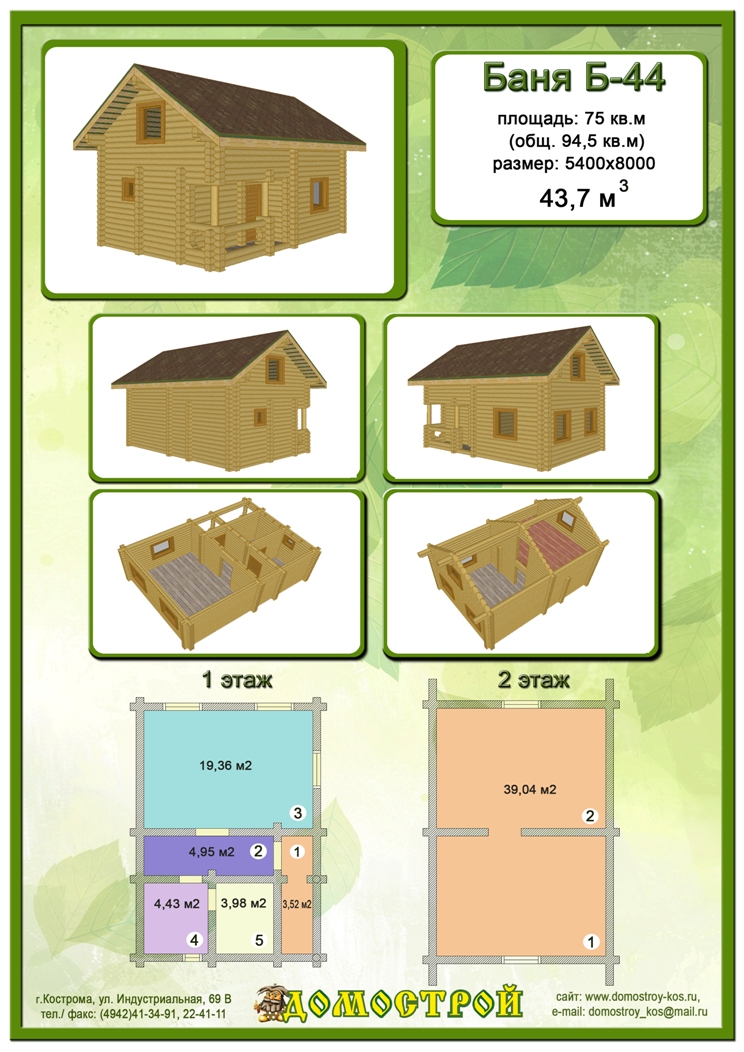 Баня Б-44 Размер: 5400х8000, Бревно D240: 43,7 м3 |