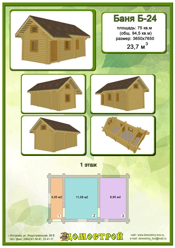 Баня Б-24 Размер: 3650х7650, Бревно D220: 23,7 м3 |