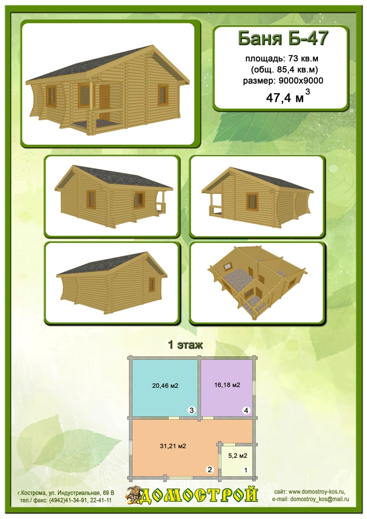 Баня Б-47 Размер: 9000х9000, Бревно D220: 47,4 м3 |