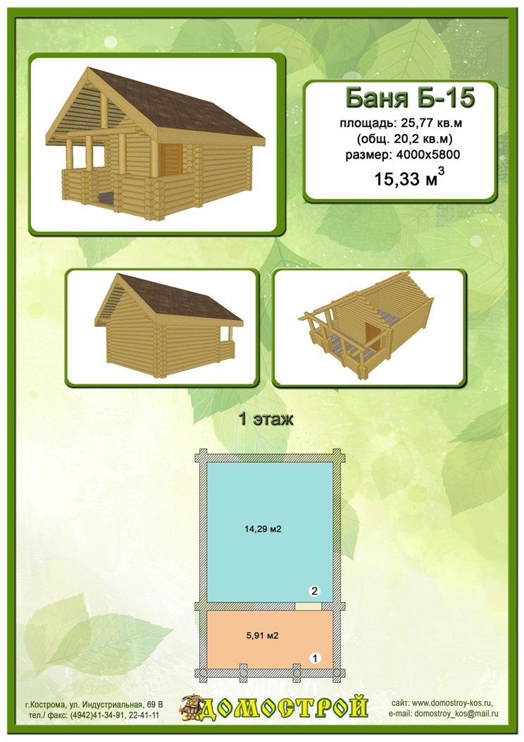 Дом Б-15 Размер: 4000х5800, Бревно D220: 15,33 м3 |