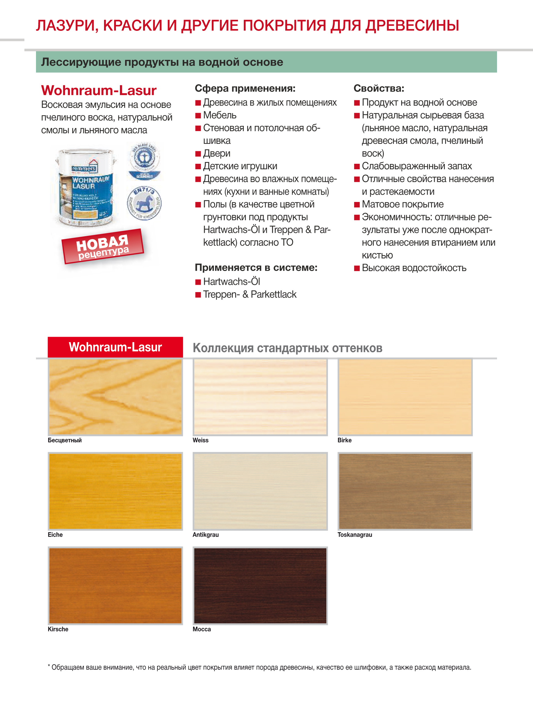 Wohnraum-Lasur Remmers Шелковисто-матовая лазурь на водной основе с содержанием масел и восков, для внутренней отделки, выкрасы на сосне.