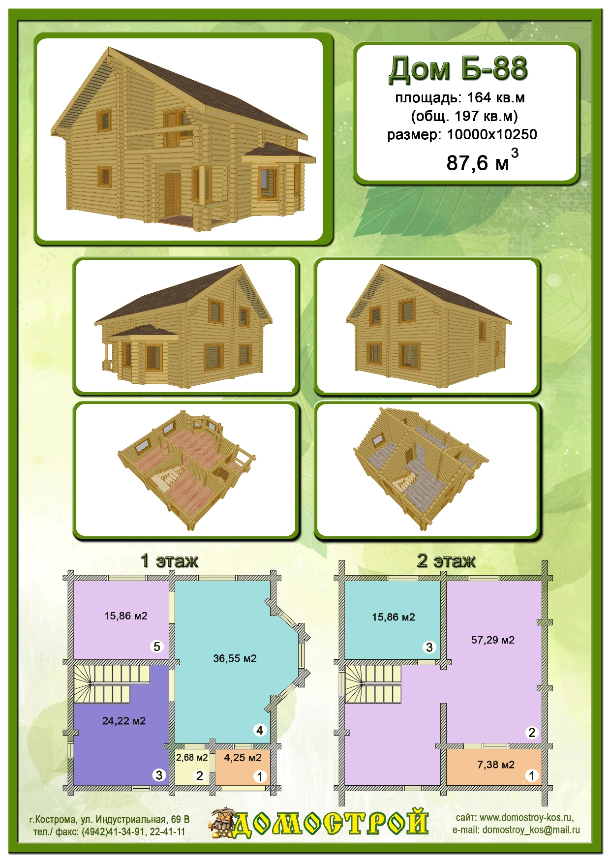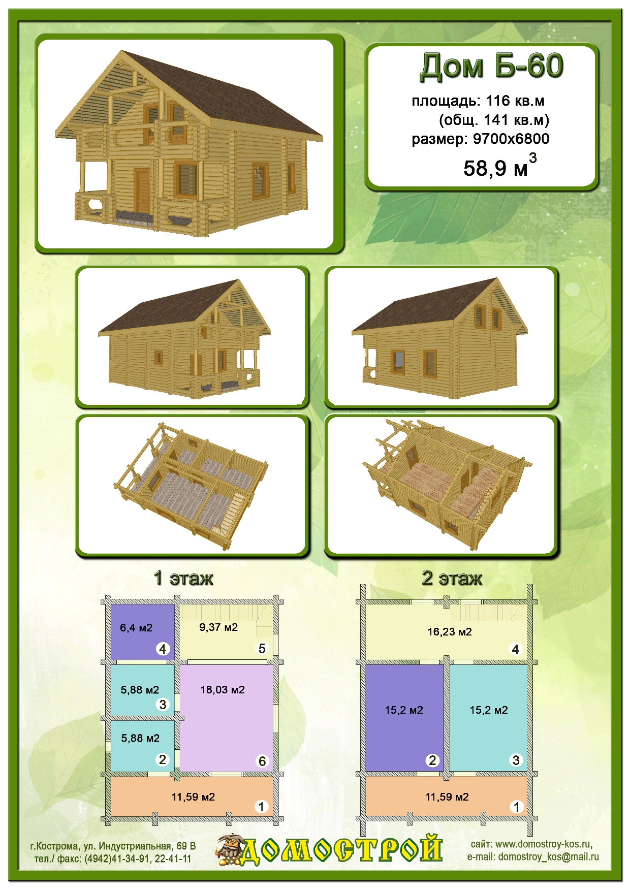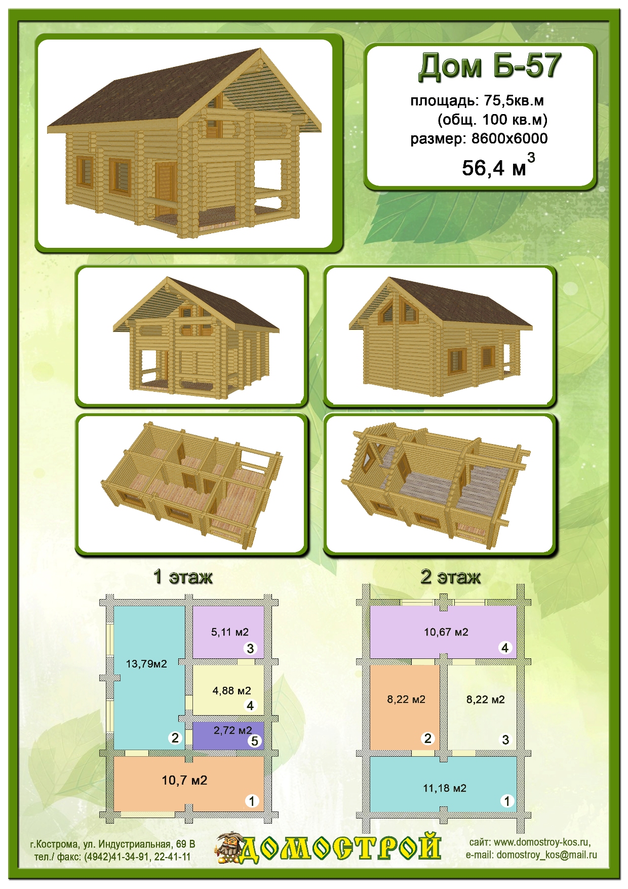 Дом Б-57 Размер: 8600х6000, Бревно D260: 56,38 м3 |