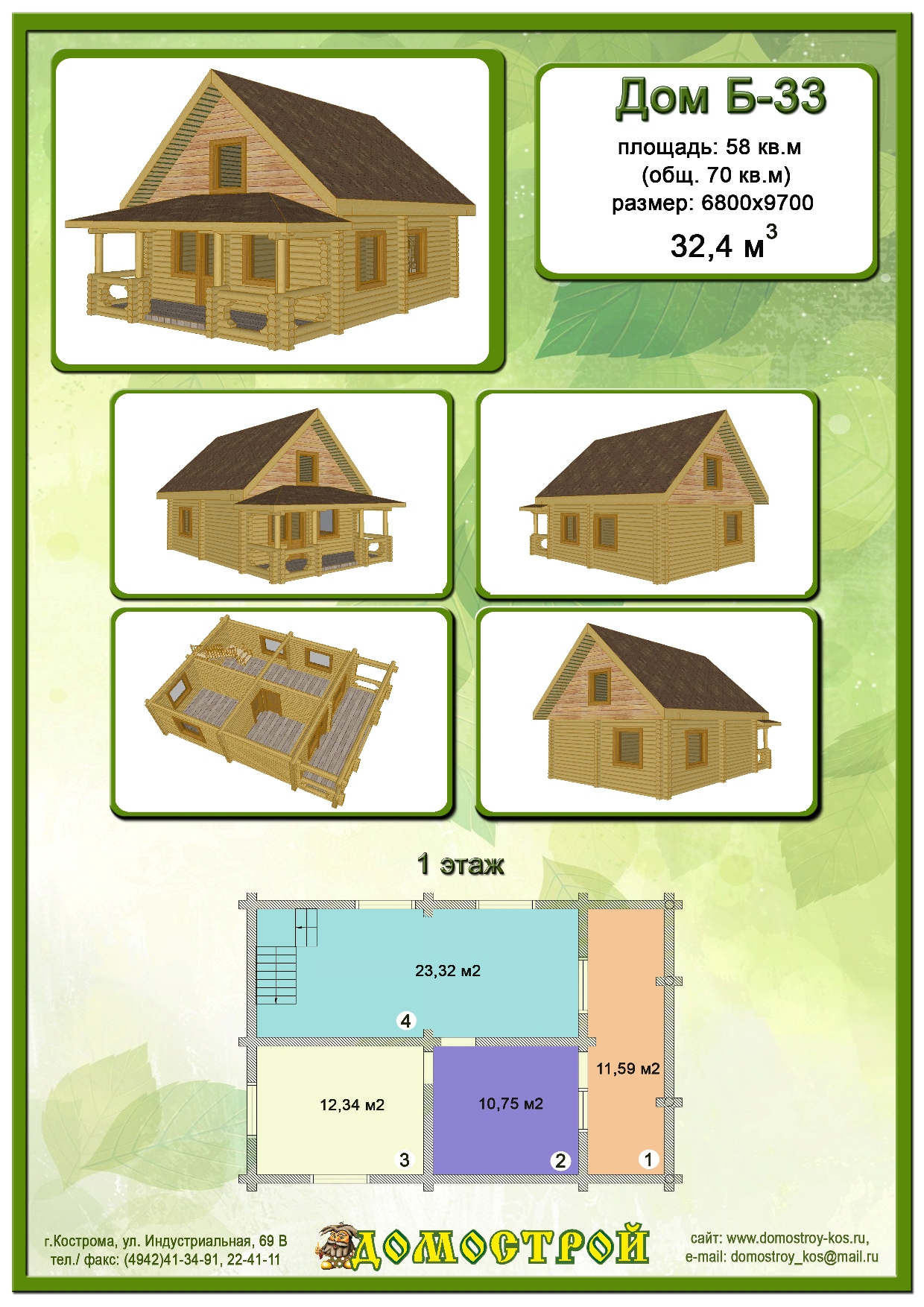 Дом Б-33 Размер: 6800х9700, Бревно D220: 32,4 м3 |