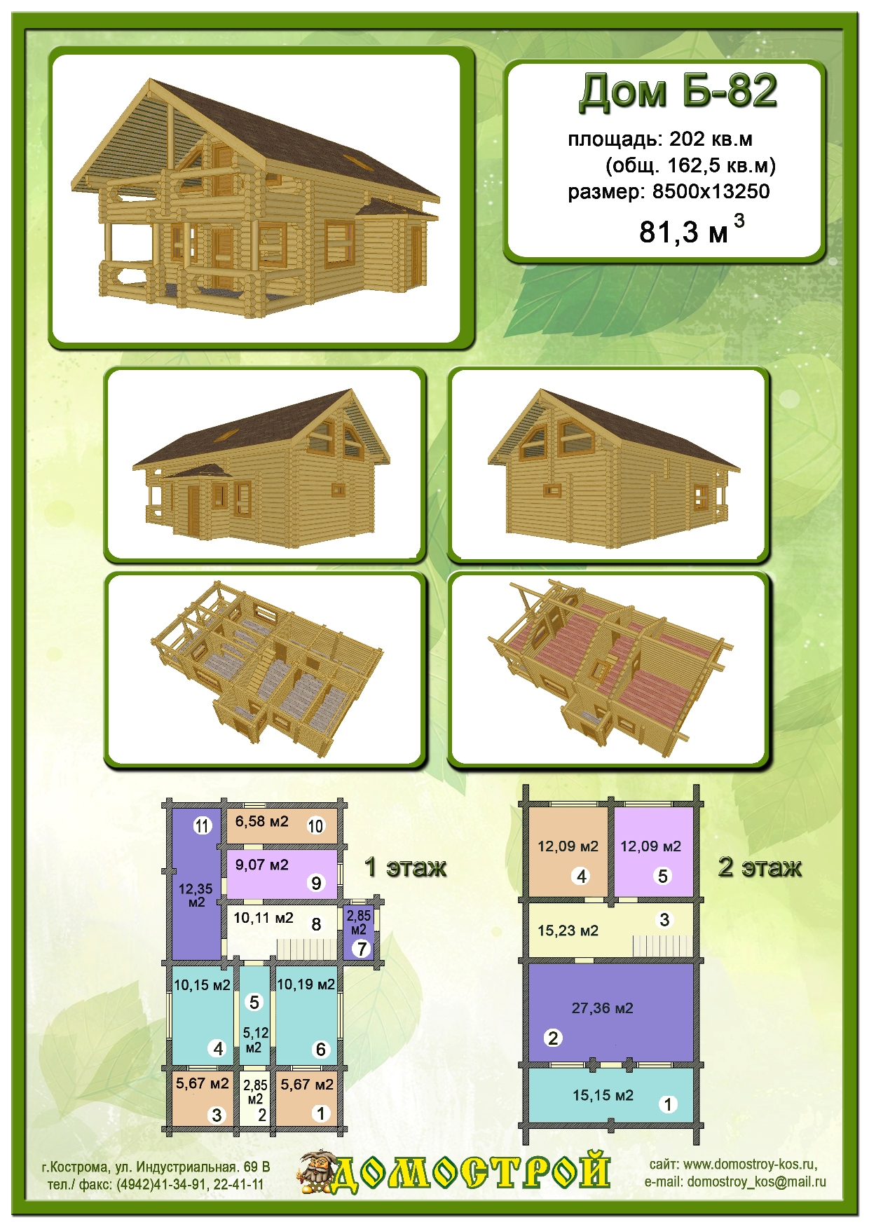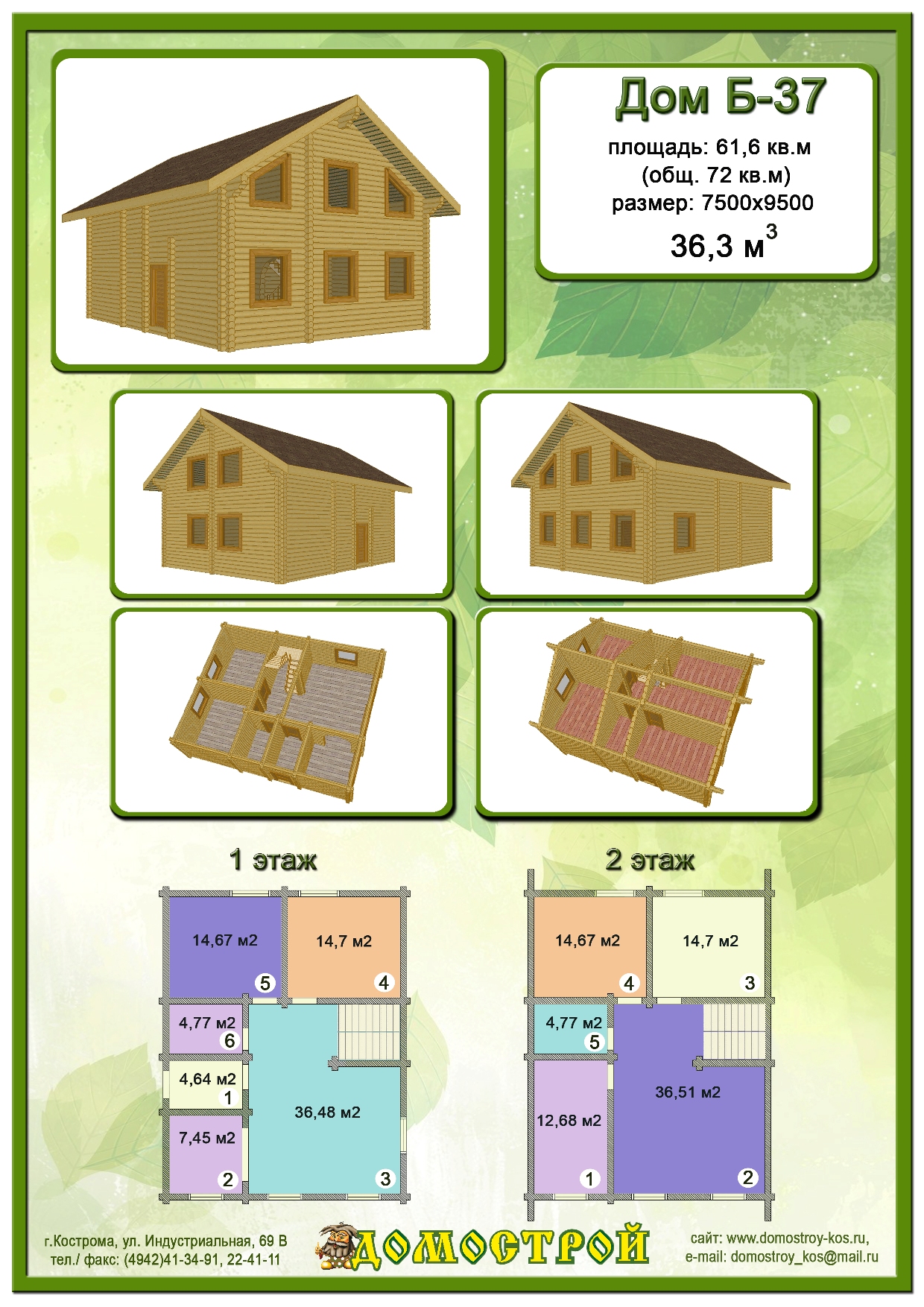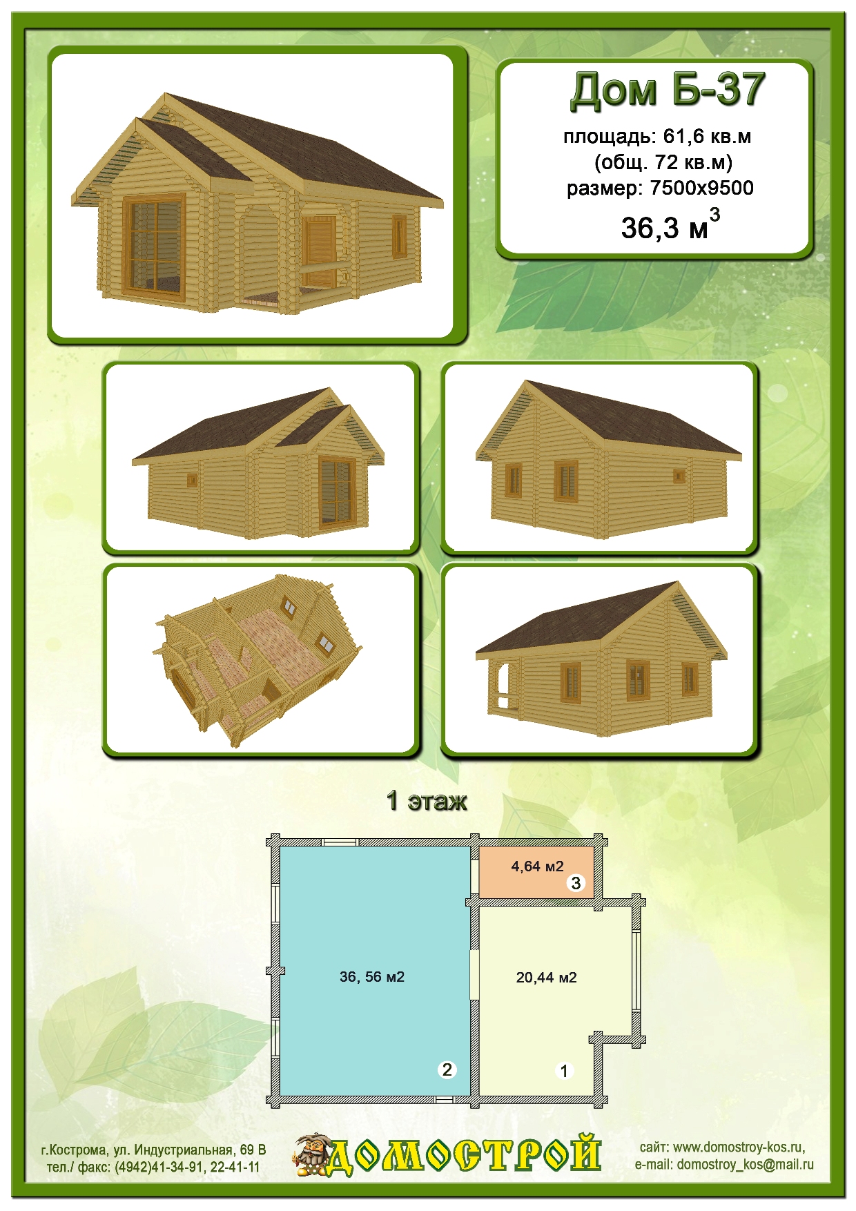 Дом Б-37 Размер: 7500х9500, Бревно D220: 36,3 м3 |
