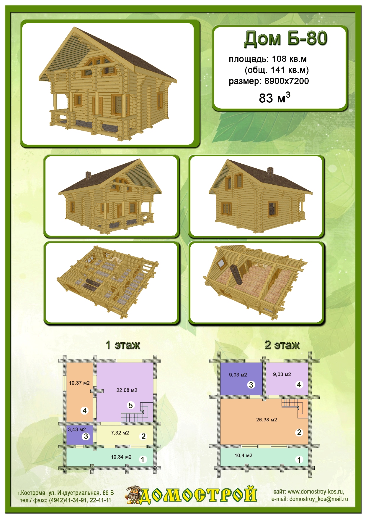 Дом Б-80 Размер: 8900х7200, Бревно D280: 83 м3 |