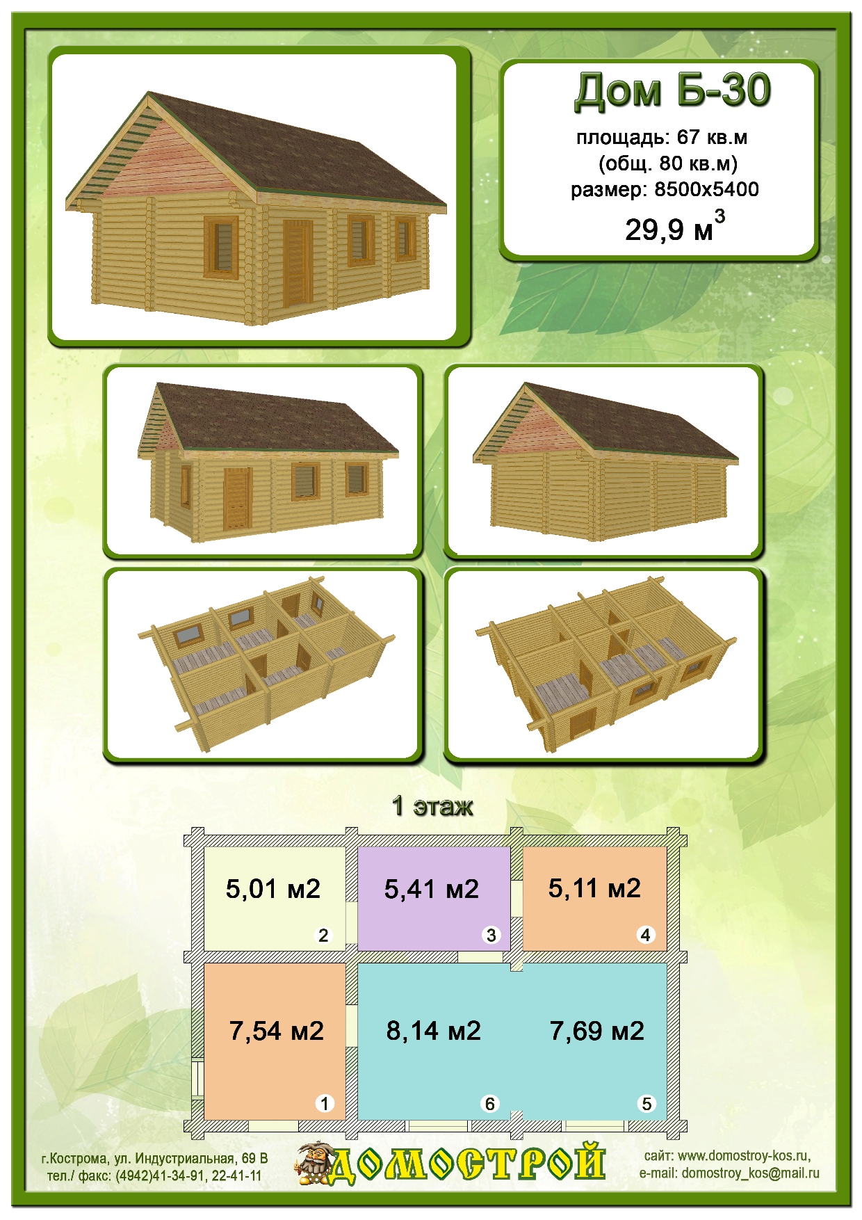 Дом Б-30 Размер: 8500х5400, Бревно D220: 29,9 м3 |
