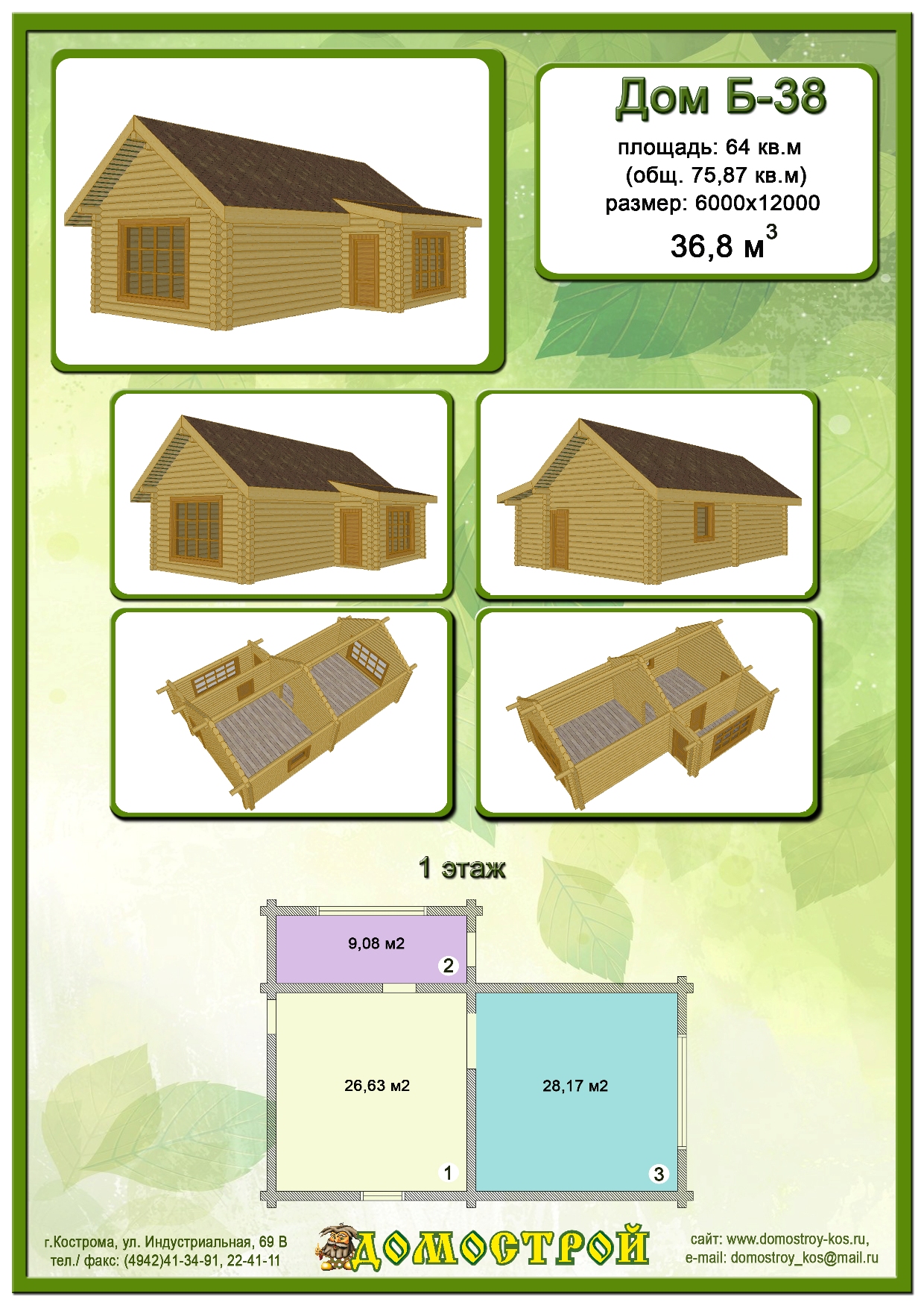Дом Б-38 Размер: 6000х12000, Бревно D240: 36,8 м3 |