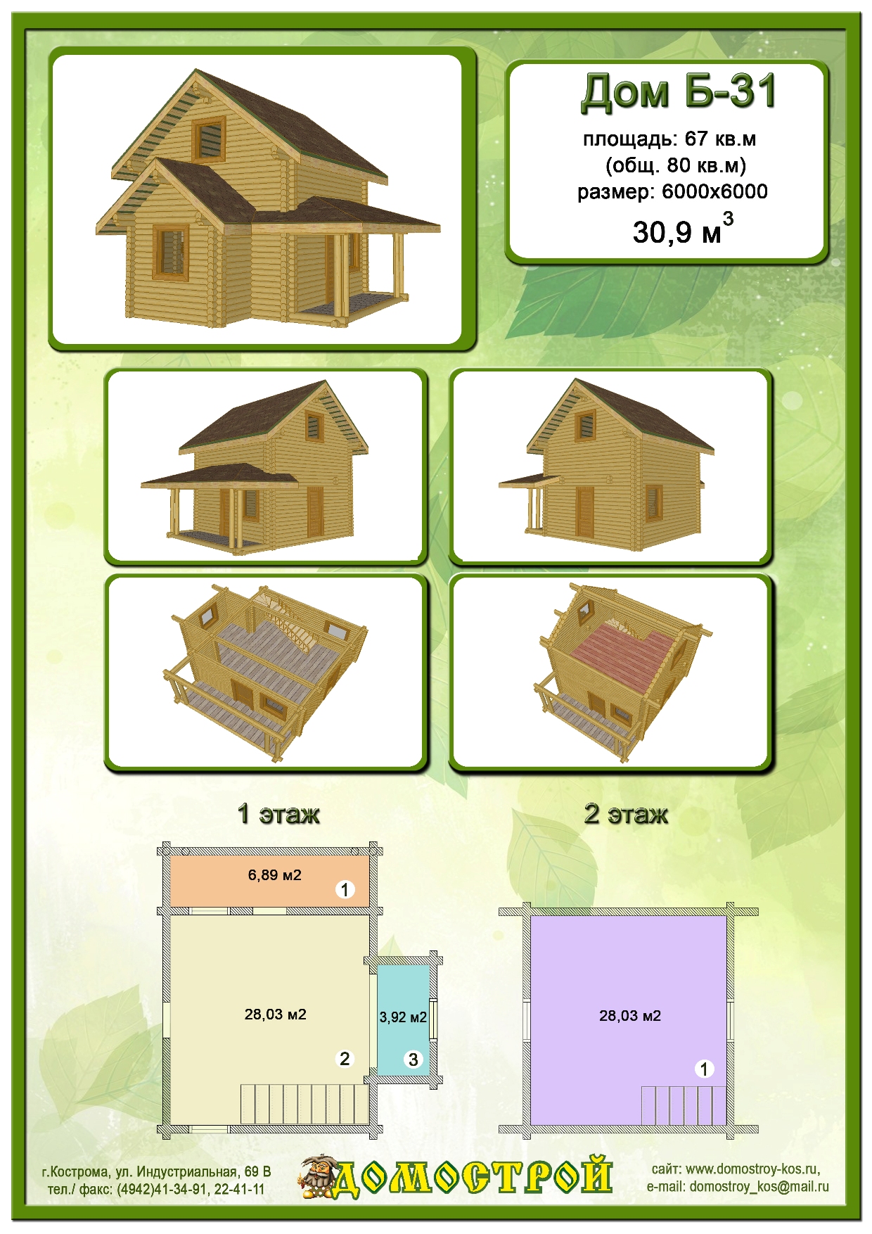 Дом Б-31 Размер: 6000х6000, Бревно D200: 30,9 м3 |