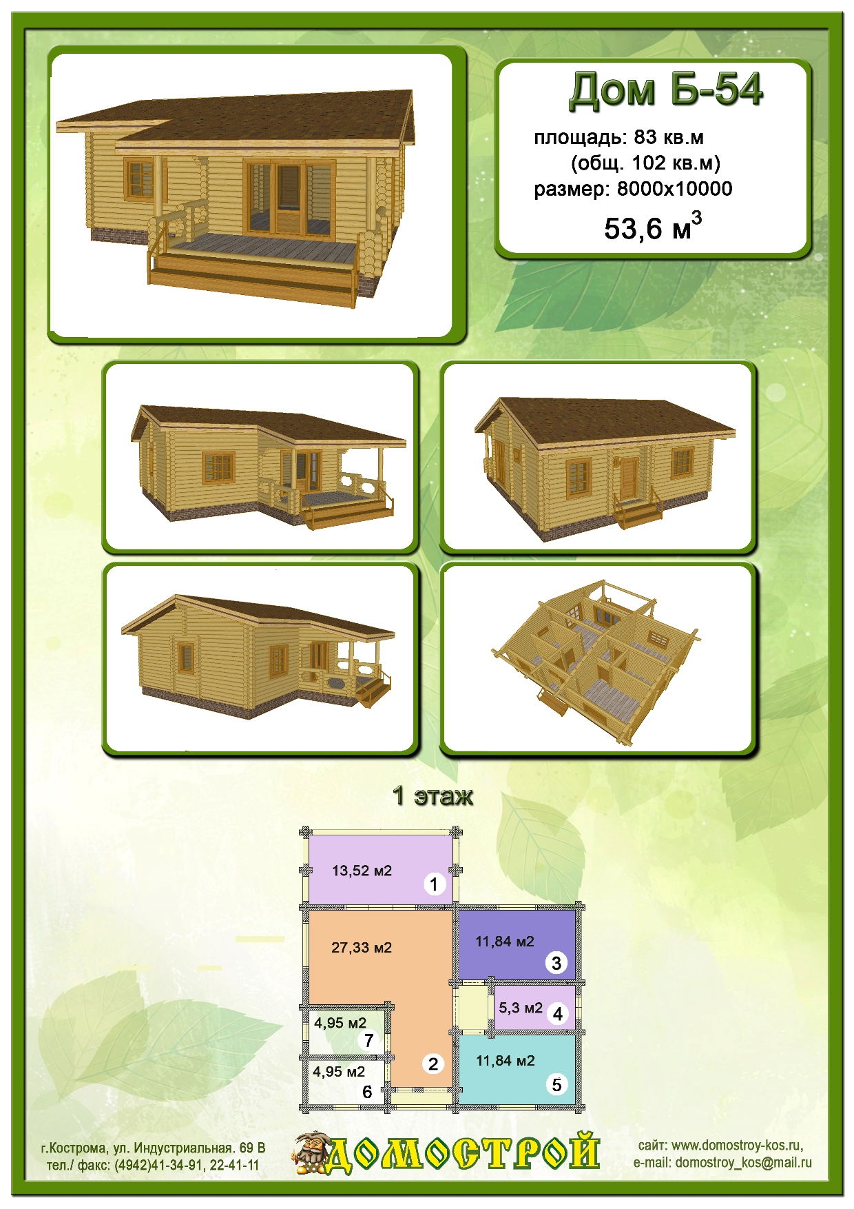 Дом Б-54 Размер: 8000х10000, Бревно D220: 53,6 м3 |