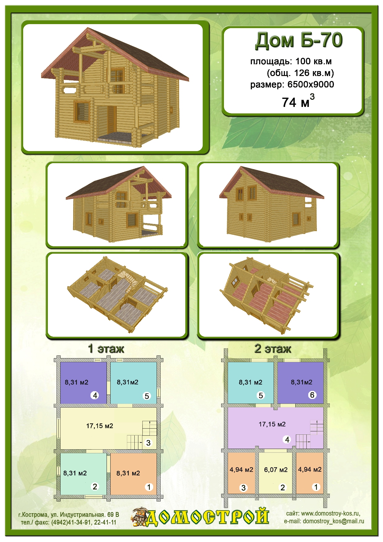 Дом Б-70 Размер: 6500х9000, Бревно D240: 73,8 м3 |