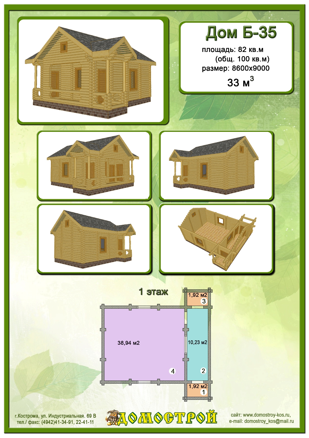 Дом Б-35 Размер: 8600х9000, Бревно D220: 32,84 м3 |