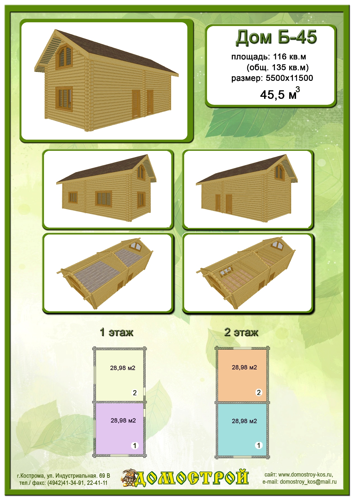 Дом Б-45 Размер: 5500х11500, Бревно D240: 45,5 м3 |